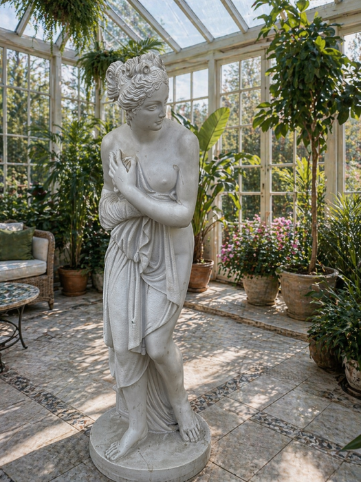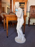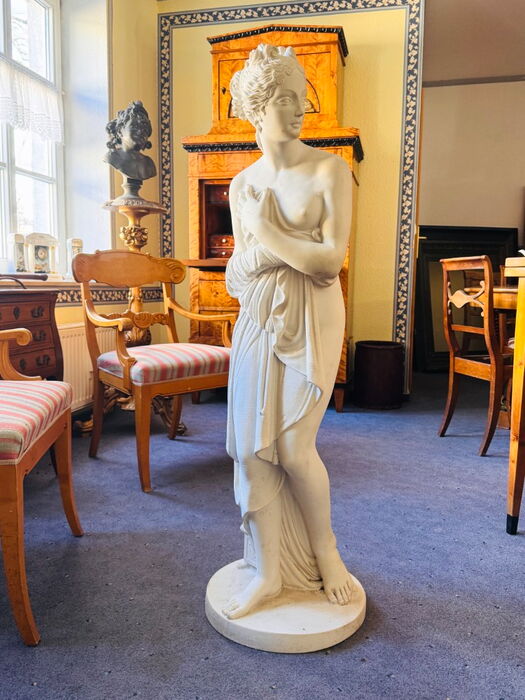 Die Figur zeigt eine anmutige Frau in klassischer Pose, die sich schüchtern mit einem Tuch bedeckt.