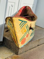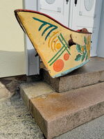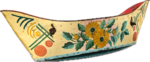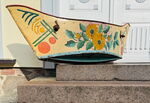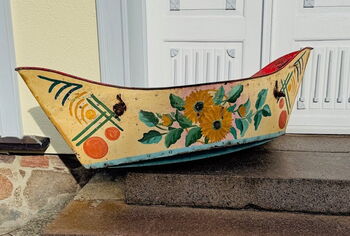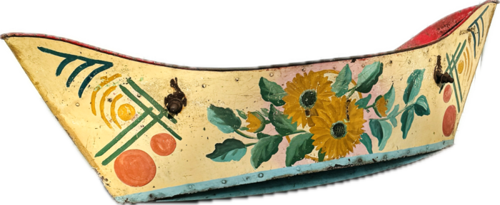 Das Design mit Sonnenblumen und geometrischen Mustern deutet auf eine handwerkliche Bemalung hin.