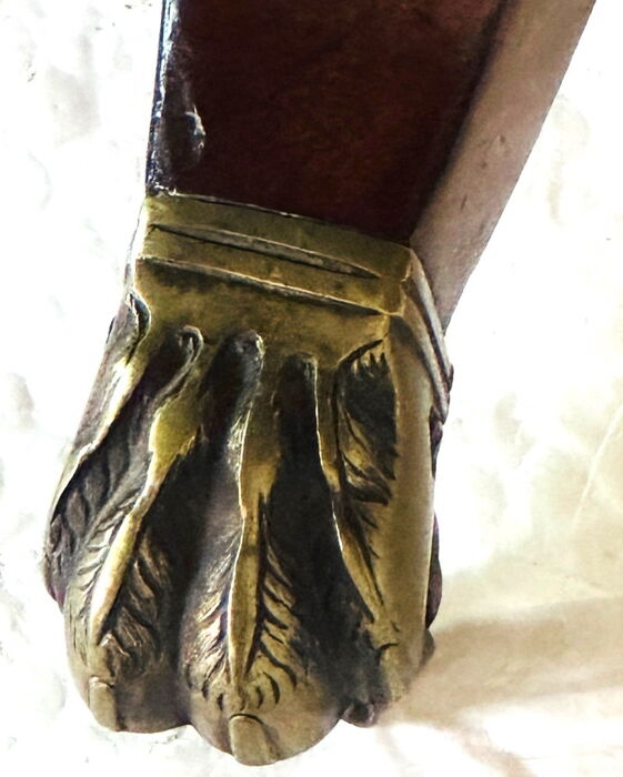 und von einen drei-passigen Fußgestell mit Messingfüßen auf Rollen gehalten wird.