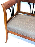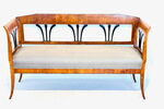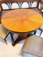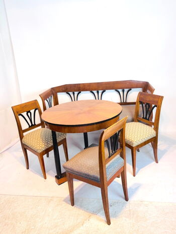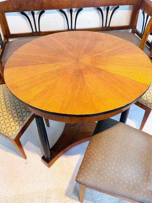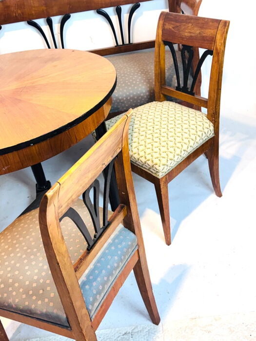 Biedermeier Sitzbank, Sitzgruppe, mit drei Stühlen u. runden Tisch, Kirschbaum, München 1820