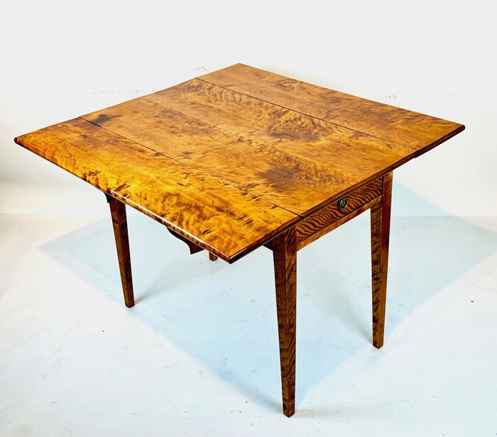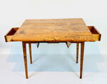 Ausgefallener Klapptisch aus teilweise massivem Birkenholz auf vier konischen Füßen stehend.